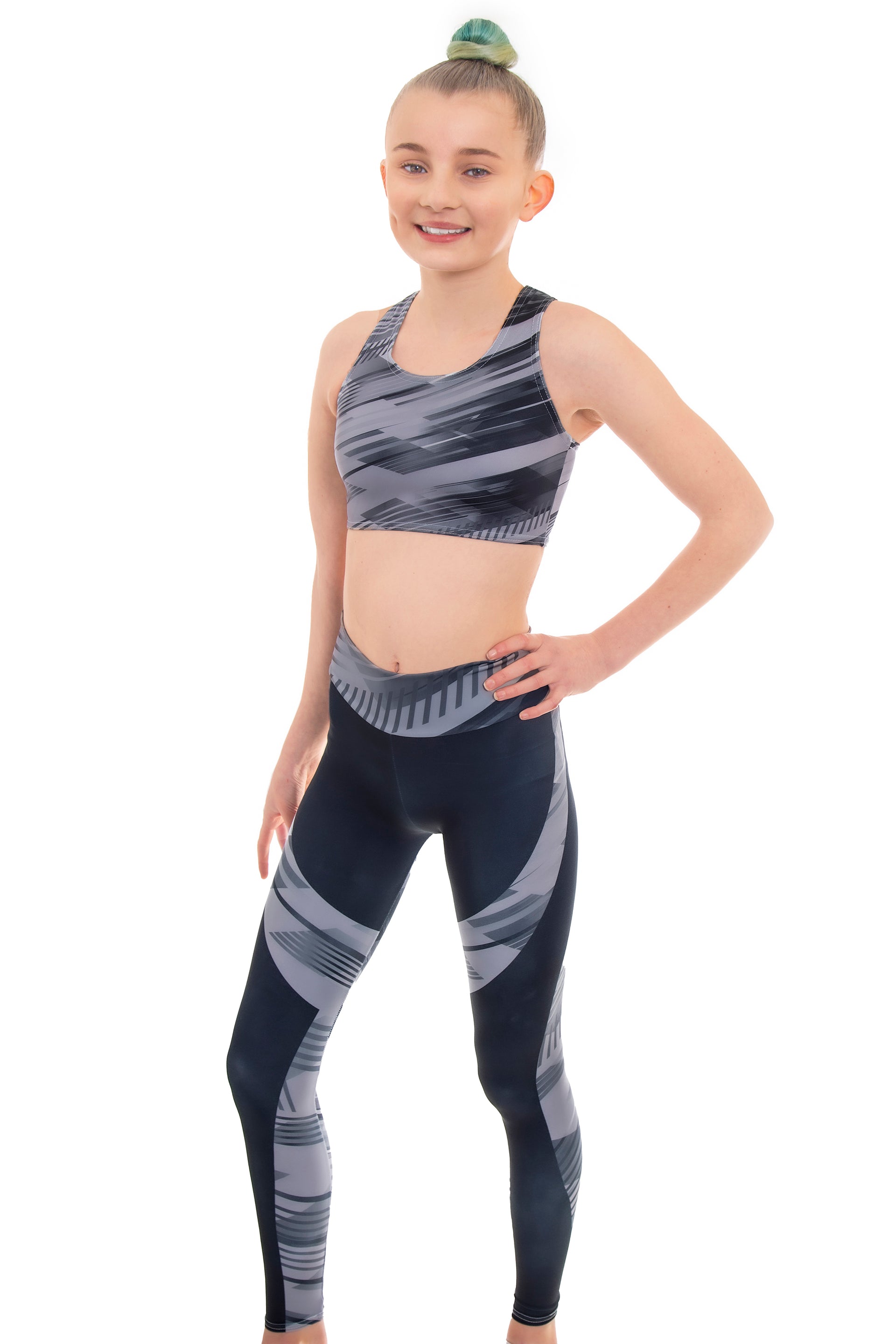 Woman wearing a green and black leotard with geometric pattern on a white background Woman wearing a green and black leotard with geometric pattern on a white background